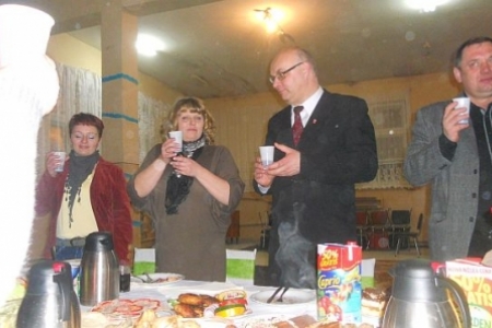 W TRAKCIE ZABAWY ZAWITALI GOŚCIE Z PREZENTAMI – WóJT IGNACY MIECZNIKOWSKI ORAZ RADNY GMINY CIESZKóW WACŁAW KORDA.