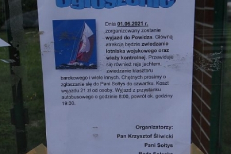GŁóWNĄ ATRAKCJIĄ BĘDZIE ZWIEDZANIE LOTNISKA WOJSKOWEGO ORAZ WIEŻY KONTROLNEJ. PRZEWIDUJE SIĘ RóWNIEŻ REJS JACHTEM, ZWIEDZANIE KLASZTORU BAROKOWEGO. CHĘTNYCH PROSZENI SĄ O ZGŁOSZENIE SIĘ DO PANI SOŁTYS. KOSZT WYJAZDU TO 21,00 ZŁ. WYJAZD I MIEJSCE ZBIóRKI DZIADKOWO PRZYSTANEK SZKOLNY O GODZ, 8.00…