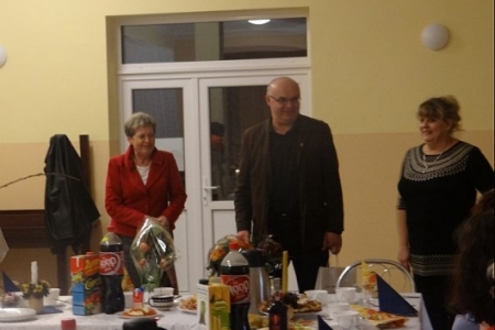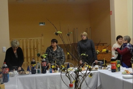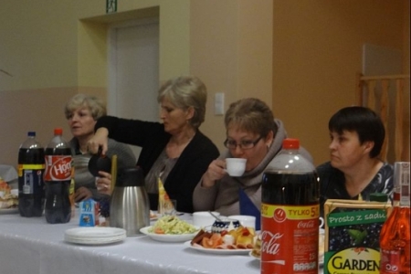DOCHODZI GODZINA 19.00 ZBIERAJĄ SIĘ PANIE W ŚWIETLICY WIEJSKIEJ. PANIE OGLĄDAJĄ I PODZIWIAJĄ ŚWIETLICE PO NIEDAWNYM REMONCIE. PRZYBYWAJĄ ZAPROSZENI GOŚCIE PANI DYREKTOR GCK W CIESZKOWIE HALINA NIEDBAŁA ORAZ WóJT IGNACY MIECZNIKOWSKI. Z ŻYCZENIAMI WRĘCZYLI UPOMINKI NASZYM PANIĄ. GOŚCIE ZWRóCILI UWAGĘ NA PTASZKI, GDZIE NASTĘPNIE NASZA MIESZKANKA WRĘCZYŁA IM SZYSZKOWE OZDOBY.