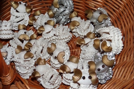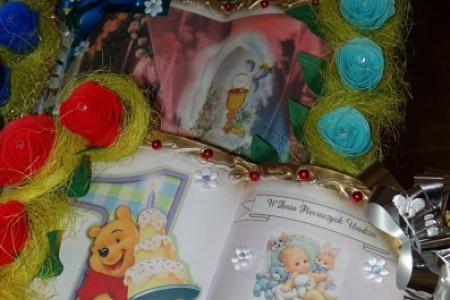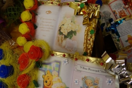 bibuły- gałązki świerku, kwiaty (róże krokusy bzy storczyki)