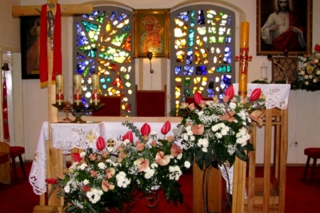 W tym roku wyjątkowo pięknie i starannie został wykonany świąteczny wystrój naszej kaplicy.Uroczyście przystrojony,żywymi jak co roku kwiatami ołtarz oraz artystycznie wykonany Grób Pański.Trzeba przyznać, że wygląda niezwykle,co zresztą widoczne jest na zdjęciach.Całość jest utrzymana w konwencji ogrodu.Stąd też wśród nieodłącznych elementów jakimi są żywe rośliny-kwiaty, wkomponowane zostało bijące źródełko płynącej wody, symbolizującej " żródło wody żywej". Na dole zaś widzimy małe oczko wodne,które może być symbolem studni Jakubowej W ten sposób pomysłodawca chciał się odnieść do tekstu biblijnego o spotkaniu Jezusa z Samarytanką przy studni Jakuba -symbolu pokuty i pojednania.Światła w kolorze niebieskim i czerwonym oświetlające postać Jezusa, mówią nam o Miłosierdziu Bożym.Pomysłodawcą całego projektu jest szczerze oddany naszej małej "godnowskiej parafii"- ks.Paweł Misiołek.Realizacja tego przedsięwzięcia nie byłaby możliwa, gdyby nie wszechstronnie uzdolnione mieszkanki naszej miejscowości.Widzimy ile serca i pracy włożono w jego przygotowanie. W pracach brały udział Sylwia i Joanna Kołodziejskie,Danuta Lipińska, Anna Karpińska oraz Bartek Gryglewicz.