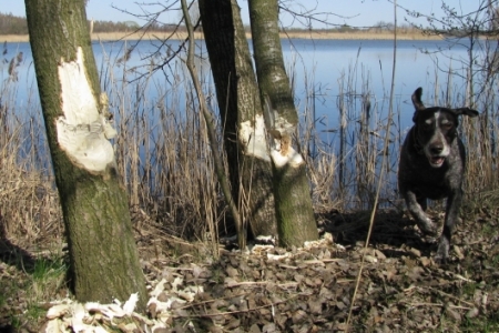 Podczas świątecznego spaceru po naszych stawach natknęliśmy na dość niezwykły widok.Otóż przy drodze głównej tuż przy łowisku na porośniętej drzewami grobli- drodze zobaczyliśmy efekty pracy największych po człowieku ssaczych konstruktorów - bobrów.W nietypowym miejscu ,bo przy samej drodze dość uczęszczanej szczególnie latem,te sympatyczne ssaki urządziły sobie ćwiczenia.Kilka pokaźnych rozmiarów drzew zostało fachowo przygotowane do powalenia.Myślę,że prace te miały charakter typowo konsumpcyjny. Ze względu na bliskość wody spuszczone drzewa można łatwiej transportować w dowolne miejsce.Poza tym leżące drzewo w wodzie dłużej zachowuje swoją świeżość.Tak zmagazynowane może stanowić budulec, lub smakołyk na gorsze czasy.