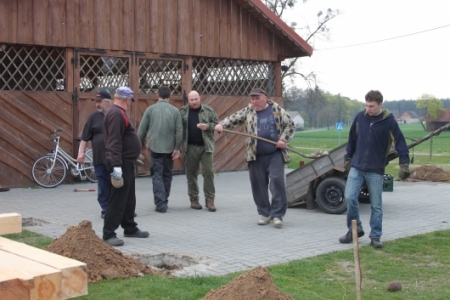 W dniu 12 kwietnia spotkaliśmy przy świetlicy, żeby kontynuować nasze dzieło budowy wiaty.Chętnych do pracy okazało się kilkanaście osób! Na samym początku nastąpił oczywisty podział obowiązków czyli : Kobitki do wiader z farbą i pędzlami !, mężczyźni do łopat, młotków itp.! A dzieci – na plac zabaw! Może i zabrzmiało to dziwnie, ale tak właśnie było. Dzięki tak sprawnej organizacji nikt sobie nie wchodził w drogę i przysłowiowo „nie plątał się pod nogami”.
