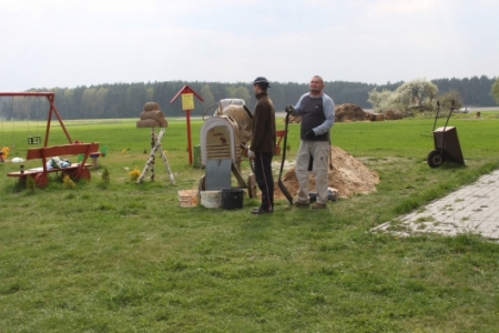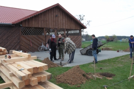 Panowie zakasali rękawy i zabrali się do kopania dołków pod kotwy. Oczywiście najpierw trzeba było ustalić strategię wkopywania, wymierzyć dokładnie odległości, pozaznaczać linie sznurkami i…. gotowe. Jak już dołki „ się kopały” to na tyłach świetlicy mieszał się beton. Tzn sam się nie mieszał, tylko Andrzej czuwał nad procesem mieszania się betonu w betoniarce;-) Następnie tak przygotowany beton trafiał na taczkę i był transportowany przez główno dowożącego Krzyśka kilka metrów dalej – do dołka