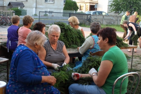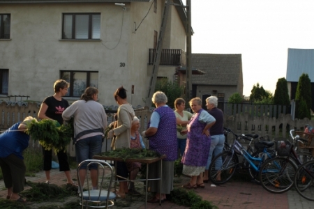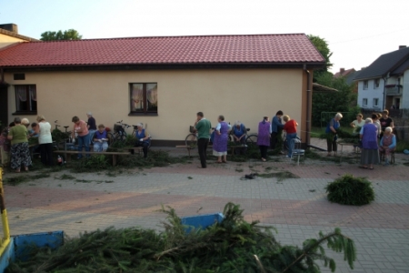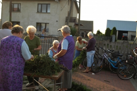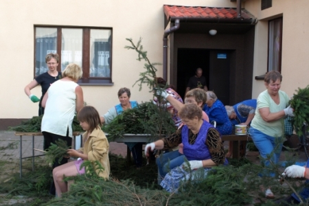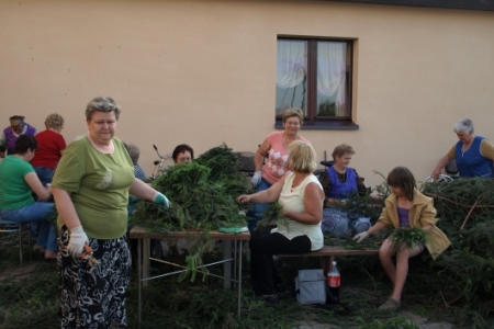 W sobotę 11 czerwca rozpoczęliśmy wspólne przygotowania do nawiedzenia kopii obrazu Matki Boskiej Częstochowskiej. W godzinach rannych panowie z naszej wioski wyjechali po gałęzie świerku które miały służyć do wykonania girland na powitanie obrazu. Pod salą wiejską i remizą spotkali się mieszkańcy Gorzyc Małych w przeważającej ilości kobiet do wspólnego wykonywania ozdób. Jak widać na załączonych zdjęciach nasi mieszkańcy oprócz pracy znaleźli czas na kawę i placek oraz na rozmowy o przygotowaniach do nawiedzenia obrazu.