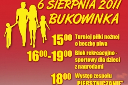 06 SIERPNIA ORGANIZUJEMY VI WAKACYJNY FESTYN W BUKOWINCE. ZAPRASZAMY WSZYSTKICH MIŁOŚNIKóW ZABAWY NA ŚWIEŻYM POWIETRZU. W PROGRAMIE PRZEWIDZIANY JEST MECZ W PIŁKĘ NOŻNĄ O BECZKĘ PIWA, KONKURENCJE SPORTOWE DLA DZIECI I DOROSŁYCH ORAZ ZABAWE TANECZNĄ. DLA OSóB LUBIĄCYCH LUDOWA NUTĘ WYSTAPI ZESPóŁ PIERSTNICZANIE. MAMY NADZIEJĘ, ŻE POGODA NAM DOPISZE..!