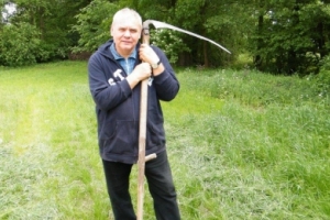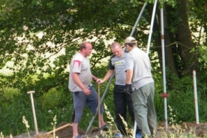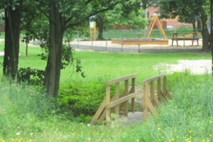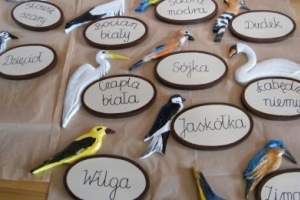 To u nas jest Gajówka z 1880 roku, którą będziecie Państwo oglądać po prawej stronie, a przechodząc przez mostek zobaczymy w głębi chatę edukacyjną z glinobitki oznaczoną tabliczką z puszczykiem. Wracając do drogi głównej szukajmy na domach oznaczeń z ptakami: niektórzy mieszkańcy nie muszą już podawać numeru domu, mogą mówić: „Mieszkam pod sroką” albo „Szukaj sikory modrej”, „Na samym początku wsi – pod żurawiem”, „Przed mostem – pod białą czaplą” itd. Bo przecież jest to wioska ptasia.